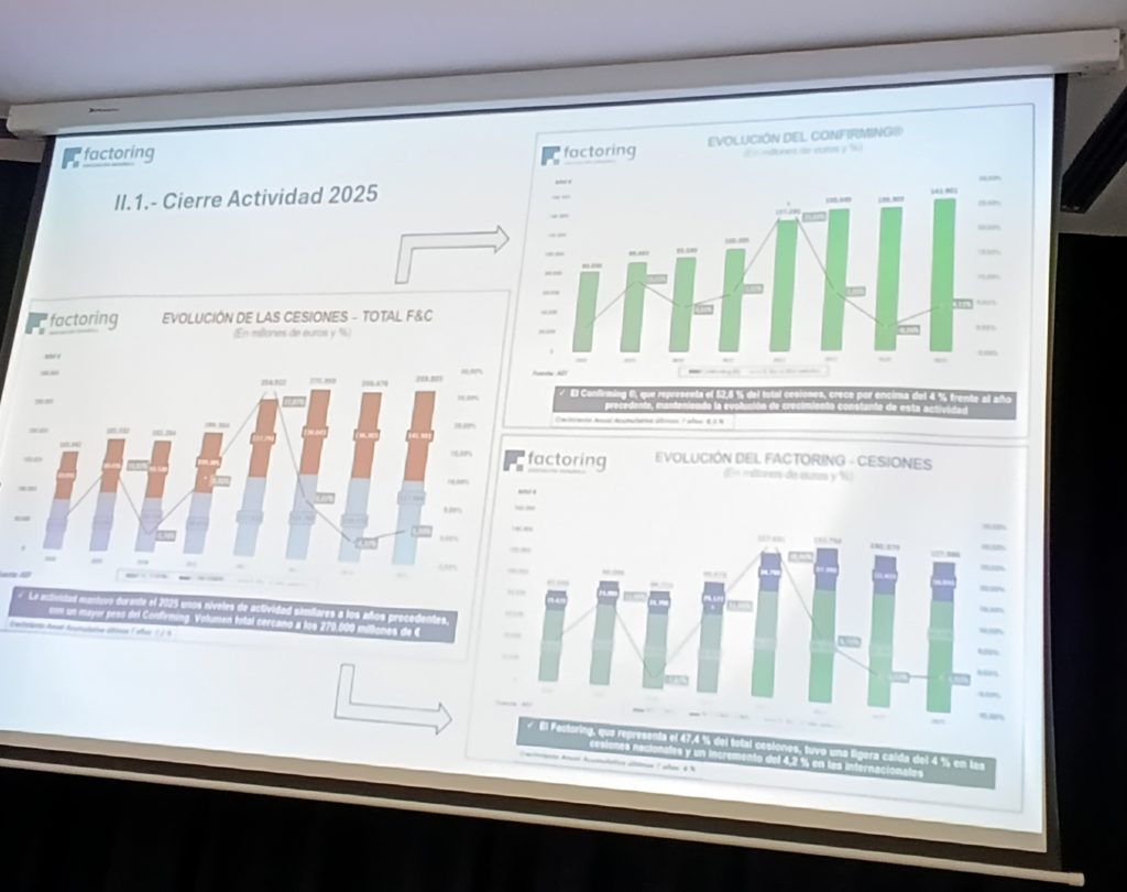 Se apuntó que el Confirming® supone un 52,6 % del total actividad del sector, habiendo ganado 4 puntos de importancia relativa frente al Factoring en los últimos años.